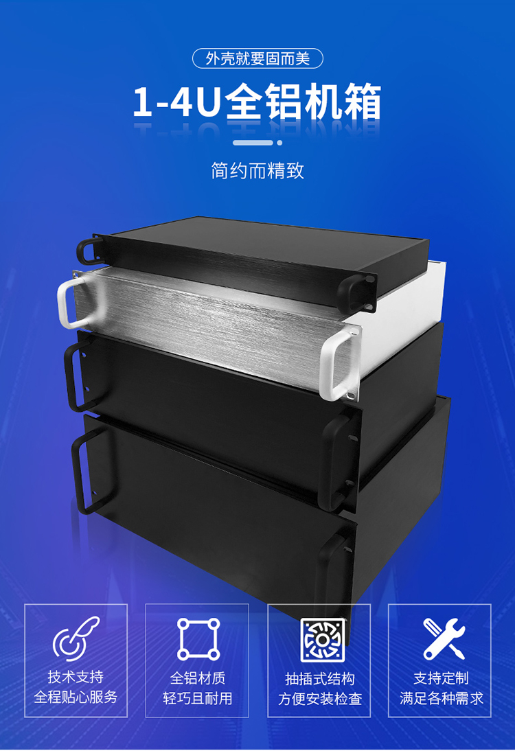 選擇一款適合自己的工控機箱至關重要,固而美制作的這款全鋁的工控機箱,性價比極高,不僅涵蓋了 1U2U 3U 4U 各類的標準尺寸,還提供了各種常規的深度來供大家選擇,例如1U300深,2U300深,2U350深,4U350深,等比較常規的尺寸。就算是沒有找到合適自己的機箱也沒關系,可以根據需求單獨定制。在U型機箱中幾U指的是機箱的寬度,也可以理解為是機箱的厚度,1U=4.45CM,以次類推就可以計算出對應幾U的尺寸。